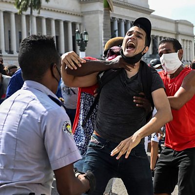 Cubans have been angered by an economic crisis, combined with anti-Covid measures. Thousands joined the biggest anti-government protests in the country for decades, and we find out more from Christopher Sabatini, senior fellow at independent policy institute Chatham House. Also in the programme, we have an interview with Sundar Pichai, chief executive of search engine Google and its parent company Alphabet. Plus, ahead of the Tokyo Olympic Games, there's controversy about a new type of running shoe which has led to a recent surge in track and field records. The BBC's Ivana Davidovic asks whether a runner's authentic ability is becoming less important for success on the track. (Picture: A man is arrested during protests in Havana. Picture credit: Getty Images.)