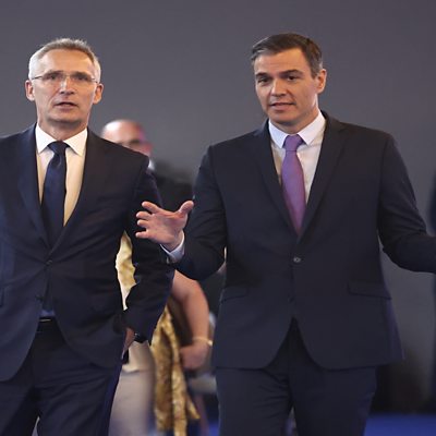 Heads of state and government from Nato's 30 member countries are meeting in Madrid to decide what the organisation's strategic and spending plan should be for the next 10 years. The proposals include a dramatic increase to the number of troops in its rapid response force, increasing weapons stockpiles and strengthening command and control. But how will it all be paid for? We speak to former Nato adviser, professor Gwythian Prins. A two-day demonstration has begun in Ghana's capital, Accra. Protesters are unhappy with recent fuel price rises and current economic conditions. Elsewhere, the fashion world mourns the death of Leonardo Del Vecchio, owner of eyewear company EssilorLuxottica - which produces Ray Ban and Oakley glasses. (Photo: Sanchez and the Secretary General Of Nato Ifema. Credit: Getty Images)