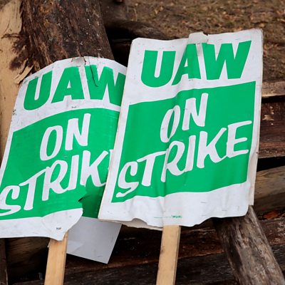 Workers at General Motors, Ford, and Stellantis are set to walkout this week if their employers fail to meet their demands for big pay raises. Nearly 150,000 want a 46% pay increase and the restoration of concessions workers made years ago when the companies were in financial trouble. Sam Fenwick discusses this and more of the business news from around with Andy Uhler, journalist and fellow of the University of Texas Energy Institute in Austin, and Jyoti Malhotra, is Editor, National & Strategic Affairs at The Print India. (Picture: "UAW on strike" picket signs lay on a pile of wood outside the General Motors Detroit-Hamtramck Assembly in Hamtramck, Michigan, U.S. October 25, 2019. Credit: REUTERS/Rebecca Cook/File Photo)