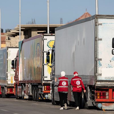 International aid agencies are waiting to get full details of the opening of Egyptian border with Gaza for aid delivery to the strip after 10 days war. The US president Joe Biden has announced that Egyptian President Abdel Fattah al-Sisi has agreed to open the Rafah crossing to a handful of trucks loaded with aid destined for the Gaza Strip. We will hear from The International Federation of Red Cross and Red Crescent Societies about they are ready to deliver this aid to the people who need it. (Picture: Aid convoy trucks loaded with supplies are seen near the North Sinai in Egypt on October 15, 2023. The aid convoy, organized by a group of Egyptian NGOs, set off today from Cairo for the Gaza-Egypt border crossing at Rafah. Photo credit: Mahmoud Khaled/Getty Images)