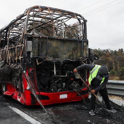 Unrest has erupted in at least 20 states across Mexico, and thousands of troops have been deployed to maintain order after the country's most wanted cartel leader, Nemesio Oseguera Cervantes - known as "El Mencho" - died after being captured on Sunday. Also on the programme: US and Iranian officials have confirmed that negotiations over Iran's nuclear programme will resume on Thursday; and we hear from Lauren Wyatt, who has Tourette's syndrome and is an advocate for the National Neurodiversity Youth Council, about the racial slur shouted by a man at the Bafta film awards who also lives with the condition. (Photo: A burnt bus on the highway connecting Mexico City with the state of Puebla, following roadblocks and arson attacks carried out by members of organized crime after the death of Mexican drug lord Nemesio Oseguera Cervantes, known as "El Mencho". Credit: REUTERS/Paola Garcia)