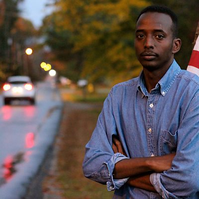 A young Somali refugee struggles to live the American dream in the USA's whitest state, during the rise of Donald Trump. Is the dream still possible? In December 2014, in 'Abdi and the Golden Ticket,' the BBC's Leo Hornak followed Somali refugee Abdi Nor Iftin as he battled to make it to America through the US green card lottery. Since then, Abdi been trying to make a new life for himself in the US state of Maine, striving to become a 'real American'. He hopes to get educated and start a career, but the pressures of supporting a family in Mogadishu make this seem ever more difficult. And then there is the plan to have his brother Hassan join him. The state of Maine remains almost entirely white, and amid growing public fear of Muslims and immigration, Abdi's American dream runs into obstacles that he never expected. Using personal conversations and audio diaries recorded over three years, 'Abdi in America' documents the highs and lows of one man's struggle to become American. (Photo: Somali refugee Abdi Nor, in Maine, standing next to a United States flag)