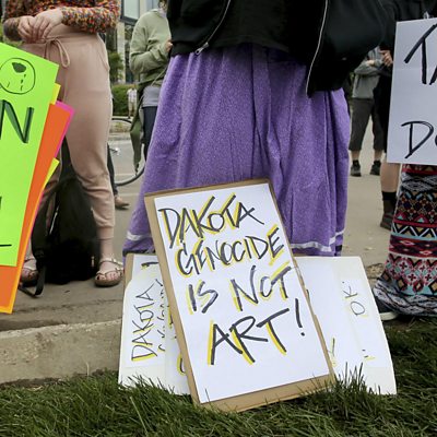 Should a divisive, traumatising sculpture have been dismantled? ‘Scaffold’, a sculpture by white American artist Sam Durant, was intended to explore America’s relationship with capital punishment. A faithful replica of seven hangman’s gallows, the work reflects the execution of 38 Dakota Indians in 1862, in what was the largest government-sanctioned mass-hanging in U.S. history. When erected by a prestigious art gallery in Minnesota, in full sight of Dakota land, protestors called the work insensitive - even, for some, an act of cultural appropriation. We hear from the artist Sam Durant as to why he’s decided to give the rights to the work over to the Dakota community, and the lessons he’s learned. And in discussion Kate Beane, historian and member of the Dakota community, is joined by Svetlana Mintcheva from the National Coalition Against Censorship to discuss who has the right to portray a traumatic past. Also this week, 80 years on from the brutal bombing of the Basque town of Guernica, how has Picasso’s mural, painted within weeks of the bombing, created such a universal and lasting legacy? With Tina Daheley Photo: Protests against the artwork 'Scaffold' at the Walker Art Center in Minneapolis, U.S.A. Credit: Alamy