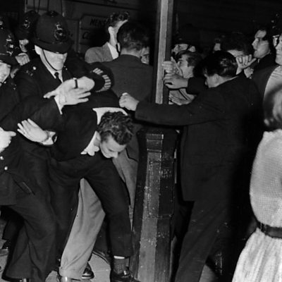 In August 1958, Britain was shocked by nearly a week of race riots in the west London district of Notting Hill. The clashes between West Indian immigrants and aggressive white youths known as Teddy Boys led to the first race relations campaigns and the creation of the famous Notting Hill Carnival. Simon Watts reports. PHOTO: Police making arrests in Notting Hill in 1958 (Getty Images)