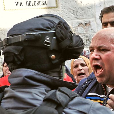 Pascale Harter introduces stories of turf wars and battles for land, by correspondents and writers around the world. The status of Jerusalem is one of the most contentious issues in the conflict between Israel and the Palestinians - so when Donald Trump announced a change in the official American policy on the city, it was bound to be controversial. Yolande Knell walked the streets of the Old City to hear what local people make of recent pronouncements. Even Buddhists can fight - with other Buddhists - over the rights to a sacred site. Mark Stratton explores how a Wat Preah Viheer - an ancient Hindu temple turned Buddhist monastery, on the Cambodian / Thai border, once turned into a battlefield. In the parched lands of Paraguay's Chaco region, Linda Pressly learns why the wildlife's coming out into the open to drink - and what that reveals about the wider thirst for water from the silted-up Pilcomayo water system in the area. And Chris Bowlby reflects on the lessons of an earlier divorce within Europe. 25 years ago, the country known as "Czechoslovakia" decided to split into separate Czech and Slovak republics - and it turned out that despite all the preparation and the national pride, there were still some unexpected hurdles to clear. Photo: A Palestinian protestor confronts a member of the Israeli security forces in Jerusalem's Old City on December 15, 2017 after US President Donald Trump's decision to recognise the city as the capital of Israel.( THOMAS COEX/AFP/Getty Images)