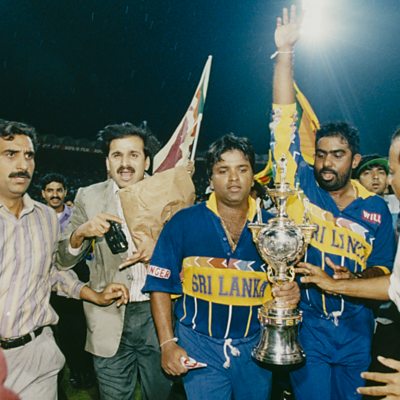 In March 1996, Sri Lanka pulled off an unexpected victory in the Cricket World Cup, demolishing a strong Australian team in the final. The win sparked wild celebrations in Sri Lanka, which had never won a tournament before and was still wracked by civil war. Emily Williams talks to the coach of the Sri Lankan team, Dav Whatmore. The programme is a Whistledown Production. PHOTO: Arjuna Ranatunga and Asanka Gurusinha with the Cricket World Cup trophy after Sri Lanka beat Australia in the final, Lahore, 17th March 1996. (Photo by Ross Kinnaird/Getty Images)