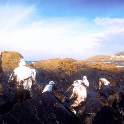 In November 2002, an oil tanker, the Prestige, sank off the coast of Galicia in north-west Spain, causing one of the worst environmental disasters in the country's history. In the following months, thousands of people from all over Spain travelled to Galicia to help clean up the spill. Simon Watts talks to Xavier Mulet, one of the volunteers. (Photo: Volunteers cleaning up after the Prestige. Credit: Xavier Mulet)