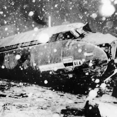 In February 1958, eight players from Manchester United’s famous “Busby Babes” team were among those killed in a plane crash at Munich airport. Goalkeeper Harry Gregg survived the disaster and went back into the wreckage several times to save lives. Simon Watts hears his story. Photo: Plane wreckage at Munich airport (AFP/Getty Images)