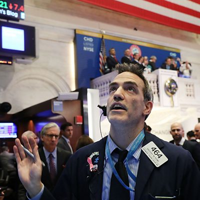 European markets have followed Asian bourses down in price as investors continued to dump shares. London, Frankfurt and Paris all fell sharply with losses of up to 3%. In the US overnight the Dow lost 4.6% and Japan's Nikkei 225 closed down 4.7%. The sell-off began last week after data in the US showed stronger wage growth, which raised expectations that US interest rates might start to rise more quickly to tackle inflation. The falls can be put in some perspective. In 2017 the Dow was up 25%, helped by a resurgent economy and strong corporate profits. Which begs the question, is this the start of a bigger decline, or just a blip? World Service economics correspondent Andrew Walker, Maike Currie of Fidelity International, David Kuo of the Motley Fool financial website and Axitrader's James Hughes lend their analysis. (Photo: Traders work on the floor of the New York Stock Exchange. Credit: Getty Images)