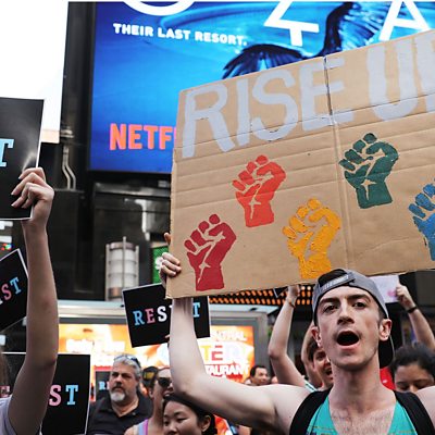 4/4 American democracy can easily frustrate change. The country’s Constitution is almost impossible to amend. The many interest groups swirling through Congress often paralyse or colonise it; and corralling 50 states is often beyond the capacity of the most able president. Yet America has been home to a string of popular movements across the last two centuries that have brought vigour and change to what otherwise might have been a sclerotic political system. It mattered, of course, that the country was born in revolution, meaning that popular resistance, beginning with the original Tea Party in Boston Harbour, is part of the nation’s DNA. We encounter the passion of America’s insurgents and the turbulence their movements generated. We begin with the struggle by African-Americans to end slavery. We continue with the titanic battles between labour and capital in the 1930s over the rights of workers and the obligations of government to regulate the economy in the public interest. And we conclude with an exploration of two 21st-Century movements: the modern-day Tea Party and the campaign for gay rights and same-sex marriage. We hear from veterans of these struggles in Ohio, California, Michigan, and New York; with museum curators in Cincinnati and Boston who are preserving and interpreting the history of past struggles; and with historians and other experts who can help us to make sense of the successes and failures of these movements, and of their role in sustaining, convulsing, and changing American democracy. (Photo: Protesters in Times Square against President Trump's decision to reinstate a ban on transgender individuals serving in the military. Credit: Spencer Platt/Getty Images)
