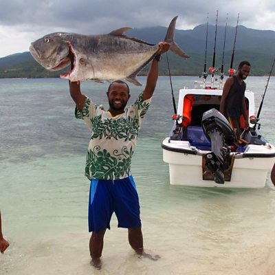 What is the fastest growing sector in tourism? It is cruise ship holidays, increasing exponentially and globally. Twenty-five million cruise vacations were taken this year and that will double very soon. International cruise lines want remote, pristine and idyllic places to satisfy the appetite of passengers to be somewhere beautiful, especially in the Pacific. In a remote, tiny community in the southern tip of Vanuatu in the South-West Pacific, a village is earning more than ever through hosting gleaming white giant cruise ships that regularly appear over the horizon. Most months more than 25,000 visitors step ashore. The attraction is Inyeug, marketed to tourists as Mystery Island - a tiny offshore reef-ringed island, fringed by a beautiful beach and surrounded by sparkling clear turquoise shallow water. Susie Emmett listens to villagers as they prepare souvenirs and village tours. She asks the captain of a cruise ship about the effects of the ships on the environment. And she joins tourists as they explore and meets the teams dealing with the debris after their departure. (Photo: Locals hold up their catch from fishing in the island of Inyeug. Credit: Green Shoots)