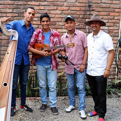 Down but not out in a Colombian border town, four Venezuelans pin their hopes on music. Cucuta is a desperate place, overflowing with Venezuelans who are streaming across the nearby border, fleeing economic collapse. In among the desperation are glimmers of hope, like the four young musicians busking their way round the city’s restaurants to earn money. Karenina Velandia, who grew up in Venezuela, follows her compatriots’ highs and lows as they try to scrape together enough to survive - not just for themselves, but for the parents, wives, and children they’ve left behind. Presenter: Karenina Velandia Producer: Simon Maybin (Image: "Llanos Sin Fronteras" - the four young musicians who busk round Cucuta. Credit: BBC)