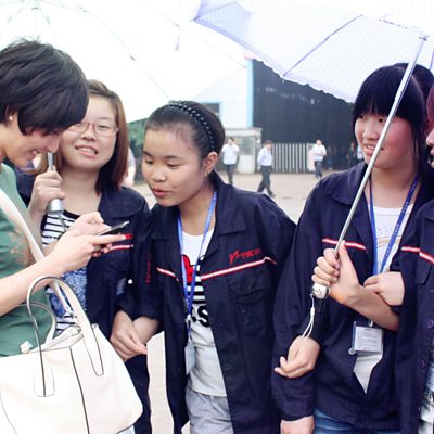 Goodpath was once an agricultural village but is now home to 61 massive factories and 40,000 migrant workers who came from rural China to better their lives. Each factory in Goodpath holds hundreds of workers. Even in the daytime there is limited natural light inside the factory plants along with incessantly loud machine noise and pungent chemical smells. The migrants work very long hours in poor conditions and then spend the rest of their time in cramped rooms often sharing living space and beds. However most have been able to buy smart phones from the local mobile phone shop and have set up social media accounts on platforms like QQ, the social media giant in China that provides instant messaging, online social games, music, shopping, microblogging, movies, and group and voice chat software. Xinyuan discovers that instead of the move to the factory towns it is in these online worlds that the rural migrants come close to the modern China they came for. Xinyuan meets Zhangfei who has many online QQ friends who all post pictures of the western life they aspire too, expensive cars, holidays and houses. These migrant workers are often frustrated by their social status even after migrating but social media provides new possibilities of social life free from social discrimination. Presenter: Xinyuan Wang Producer: Kate Bissell (Photo: Xinyuan Wang talks to factory workers, all of whom use QQ on their smartphones)