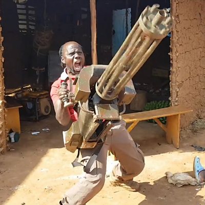 Uganda's home-grown film industry is proving a hit on YouTube, but does it glorify violence? Ed Butler heads to Wakaliga on the outskirts of Kampala to investigate, only to get shot with fake bullets. Programme features interviews with the American immigrant studio boss Alan Hofmanis, director and screenwriter Isaac Nabwana, special effects supremo Dauda Bisaso, and British fan Timon Singh of the Bristol Bad Film Club. Expect the Unexpectable! (Picture: Dauda Bisaso mans his home-made prop gatling gun; Credit: BBC)