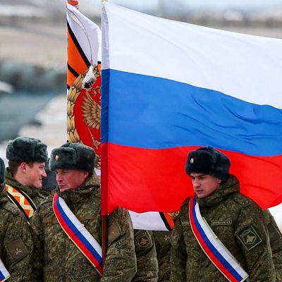 The economy of Russian occupied territories in Ukraine. Ed Butler reports on the people living between western Ukraine and the eastern occupied territories including the city of Donetsk, and the flow of goods and people across an active front line. (Photo: Russian servicemen near the Crimean town of Dzhankoy, 12 miles away from the Ukrainian border, Credit: Getty Images)