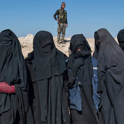 What's next for the thousands of foreign women who have been living with Islamic State fighters in Iraq and Syria? The situation was highlighted after a British and an American woman expressed the desire to return to their countries of origin. With the Islamic State's rapidly shrinking territory, thousands of foreign born women - many with children - have fled the fighting and are sheltering in refugee camps. Ritula Shah and a panel of expert guests discuss what should happen to them now. Do they deserve to be resettled in their countries of origin? Or are their governments right to reject their citizenship? And what will happen to the children of IS fighters who have a right to reside in Europe or America? (Photo: A fighter with the US-backed Syrian Democratic Forces keeps watch near veiled women standing on a field in Syria by Fadel Senna / AFP/Getty Images)