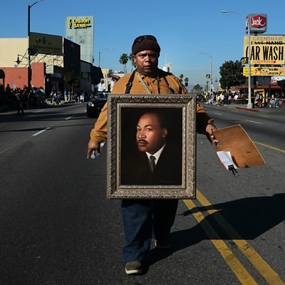 Dr Martin Luther King Jr once had a dream that his children "would one day live in a nation where they will not be judged by the colour of their skin but by the content of their character”. Fifty years on from his assassination, we speak to the artists working to keep the spirit of Dr King and his dream alive. We head to Dr King’s home city of Atlanta, where the award-winning radio presenter Rose Scott speaks to Atlanta's citizens about his legacy. The gospel and soul legend Mavis Staples shares her memories of Dr King. Plus, actor and playwright, Anna Deavere Smith discusses Notes From The Field, her one woman show, which brings to life the stories of ordinary Americans among them current and former inmates, protesters, educators and politicians. We hear from the radical revolutionary artist Dread Scott on the power of protest art and how he creates work that speaks out against oppression in the age of #blacklivesmatter. Presenter: Rose Scott. (Photo: Artist Al Hornsby walks with his painting of Martin Luther King Jr as he participates in the Martin Luther King Jr. parade in Los Angeles, California. Credit: JOE KLAMAR/AFP/Getty Images)