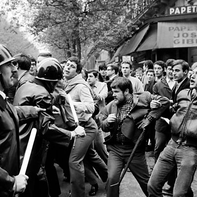 A French riot policeman's view of the violence that swept through France in May 1968; plus the man who led a team that made safe two nuclear weapons that had crashed to ground in the US. Also, the origins of Montessori education, one of the airmen on the Dambusters' raid and actor Jane Asher remembers John Osborne's radical 1950s play, Look Back in Anger. Photo: Protesters face police in front of the Joseph Gibert bookstore, Boulevard Saint Michel in May 1968. (Credit: Jacques Marie/AFP/Getty Images)