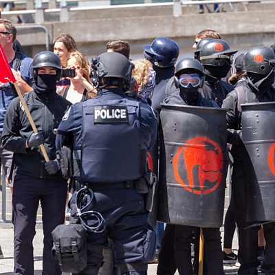 There is a disturbing new wave of political street violence in America. Groups on the far right and the far left have clashed in New York, Berkeley, California, and Charlottesville, Virginia. But one liberal enclave is the main battleground: Portland, Oregon - a progressive city in the Pacific north-west. BBC Trending has visited Portland to meet two activists who have traded insults and threats online, as well as confronting each other in the streets. What drives anti-fascist Luis Enrique Marquez? And why has marijuana farmer Rob Cantrall joined the Proud Boys, which one anti-extremism organisation has dubbed a hate group? Presenter: Mike Wendling Producers: Linda Sills and Natalia Zuo (Photo: Anti-fascist activists line up in front of police in Portland. Credit: Getty Images)