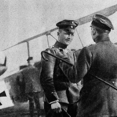 Using archive BBC recordings of veterans, we tell the story of one of the most famous figures of World War One. The legendary German air ace Baron von Richthofen who was killed in April 1918. Photo: German First World War air ace Manfred von Richthofen, known as the Red Baron, with a comrade in front of his famous red tri-plane. (Photo by Hulton Archive/Getty Images)