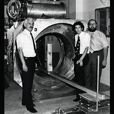 The first magnetic resonance scan of a human body was attempted by Dr Raymond Damadian and two students in 1977. It marked a breakthrough in efforts to develop the medical technology now known as the MRI scanner. MRI uses a powerful magnetic field and radio waves to produce images of the inside of the body. Dr Damadian spoke to Ashley Byrne about his early experiments. Photo: Drs Raymond Damadian, Lawrence Minkoff and Michael Goldsmith and the completed Indomitable scanner.(Courtesy: FONAR Corporation)