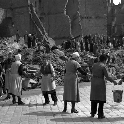 At the end of WW2 much of Germany's capital had been destroyed by bombing and artillery. Almost half of all houses and flats had been damaged and a million Berliners were homeless. Caroline Wyatt has been speaking to Helga Cent-Velden, one of the women tasked with helping clear the rubble to make the city habitable again. Photo: Women in post-war Berlin pass pails of rubble to clear bombed areas in the Russian sector of the city. (Photo by Fred Ramage/Keystone/Getty Images)