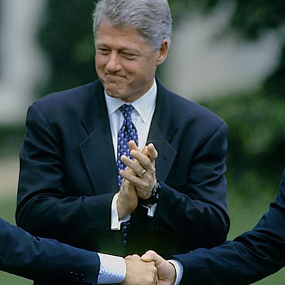 In August 1994 Yitzhak Rabin became the first Israeli leader publicly to visit Jordan. But in fact talks had been going on for years. Former head of Mossad, Ephraim Halevy, was Israel's secret peace envoy. He's been telling Louise Hidalgo about Rabin and King Hussein of Jordan's clandestine meetings during the often fraught road to peace. Picture; US president Bill Clinton looks on as King Hussein and prime minister Yitzhak Rabin shake hands on the White House lawn in July 1994 ahead of a formal peace treaty between Israel and Jordan later that year. (Credit: Mark Reinstein/Corbis via Getty Images)