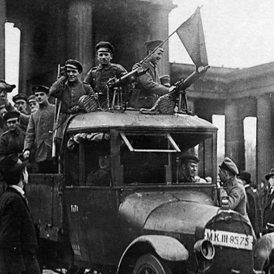 After four years of war Germany was on the verge of defeat. Its armies were exhausted and in retreat, its civilian population enduring hardship and hunger. As unrest grew at home, the German government and military struggled to maintain control. The German Kaiser was forced to abdicate. Germany became a republic. Hear first-hand accounts from the BBC archive of how the disastrous end to the First World War provoked revolution in Germany. Photo: Revolutionaries in a truck with machine guns in front of the Brandenburg Gate in Berlin, November 1918 (Photo by Culture Club/Getty Images)
