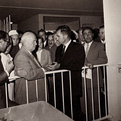 US Vice President Richard Nixon and Soviet leader Nikita Khrushchev had an argument about living standards when Nixon visited Moscow in 1959. They spoke at an exhibition of a 'typical' American house full of modern domestic appliances. Photo: The two leaders surrounded by press at the exhibition in Moscow, 1959. (Photo credit: Universal History Archive/UIG via Getty Images)
