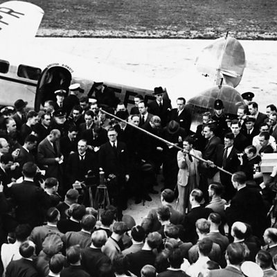 In September 1938 Britain's Prime Minister Neville Chamberlain flew back and forth to Germany to negotiate with Adolf Hitler. He hoped to guarantee "peace for our time". He agreed that Germany could take over the Sudetenland in western Czechoslovakia, as part of a policy known as appeasement. Photo: The Prime Minister meets the press on his return from his first trip to Germany on September 16th 1938. Copyright: BBC.