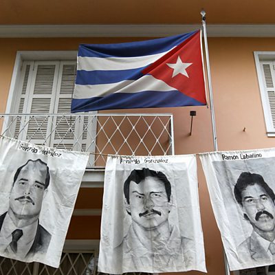 Five Cuban spies were arrested in Miami by the FBI in September 1998. After a controversial trial, they were given lengthy jail sentences. The last of the five was released in December 2014 as part of a prisoner swap for an American intelligence officer. Mike Lanchin has been speaking to one of the Cubans, Rene Gonzalez, who was released in 2011. (Photo: Portraits of the Cuban Five. Credit: Nelson Almeida/AFP/Getty Images)