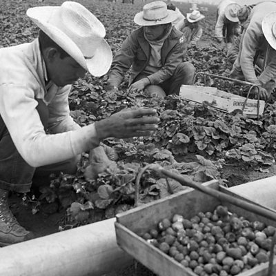 During the last years of World War Two, the American government began hiring poor Mexicans to come to work legally on US farms. The scheme was known as the 'Bracero' programme and lasted until 1964. Mike Lanchin presents archive recordings of some of those involved in the programme, using material collected by the University of Texas at El Paso. Photo: A group of Mexican Braceros picking strawberries in a field in the Salinas Valley, California in June 1963 (Getty Images)
