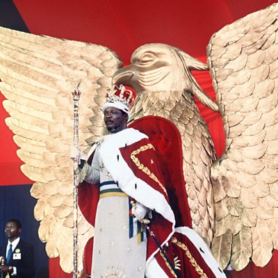 Jean-Bédel Bokassa crowned himself Emperor of the Central African Republic in a lavish ceremony on the 4th of December 1977. He'd already been President for several years since taking power in a military coup - but he wanted more. Janet Ball has spoken to one of his sons, Jean-Charles Bokassa, and to a French journalist, about the events of that day. Photo: Jean-Bédel Bokassa, stands in front of his throne after crowning himself. 04 December 1977 in Bangui. (Credit: Pierre Guillaud/AFP/Getty Images)