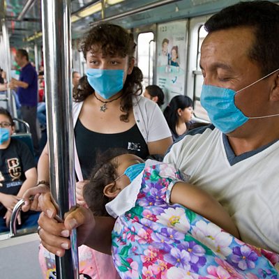 Mexico City, the world's third largest metropolis, was effectively shut down when a new and deadly virus, swine flu appeared. Soon the virus started to spread and was seen as a massive threat to global health. Experts feared millions of people could become infected and many countries began screening airline passengers for symptoms and suspending flights to Mexico. Photo: People wear surgical masks as they ride the subway in Mexico City (Ronaldo Schemidt/AFP/Getty Images)