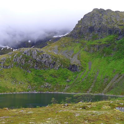 Wildlife sound recordist Chris Watson accompanies Sami Joiker, Andé Sombe, on a journey up a mountain on the Lofoten islands in Norway to explore the relationship between the sounds of the mountain, the people and the wildlife. As Chris discovers, for many Norwegians the soundscape is part of the fascination and attraction of the mountains. The mountains offer an escape from urban and man-made noise to Nature’s symphony which is composed amongst other things of the sounds of running water produced by the glacial streams, the whisper and roar of the wind, the chorus of song birds and the cry of soaring ravens high overhead. Looking around Chris is reminded that this is an Arctic landscape but in recent years the glacial ice has been melting in some of Norway’s highest mountains and we learn how a team of archaeologists have been recovering thousands of artefacts, some of which date back 6,000 years. But it is also the quality of the sounds here that intrigues Chris, and during the climb gradually he begins to understand something of the deeper more spiritual connection with the earth which is so intrinsic to the Sami culture. For Andé the mountain soundscape and his relationship to the wolves which were once so prevalent here, inspires a joik, a Sami chant, which he performs at the peak of their climb. (Photo: Mountain lake and crater Lofotens Islands, Norway. Credit: Chris Watson)