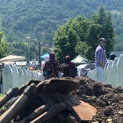 On July the 11th every year, the bodies of those who Sasa helped to identify over the past 12 months are re-buried in a Muslim service and Anna will witness the ceremony at the sprawling Potocari Cemetery and meet the families on a pilgrimage to honour the ones they loved and lost. Anna Holligan has listened to the details of unspeakable terror as the BBC’s correspondent in The Hague and will travel to the scenes of Mladic’s crimes to meet the Muslim families still haunted by the war of 25 years ago and the massacre of thousands at Srebrenica. Sasa was four years old when soldiers drove into his home town of Mostar – his family was a mix of Bosnian Muslim and Serbian Orthodox and the war ripped it apart. He is now a translator, and recently worked at the trial of Ratko Mladic. Samir Chosić is shovelling earth, a job that stirs his own painful memories of fleeing for his life, as thirty-five freshly dug graves readied for fragments of bones to be laid to rest. An estimated 12,000 people of all faiths, Muslims, Christians, Jews and others are still missing - feared slaughtered - right across this troubled Balkan territory. As she travels around Bosnia-Herzegovina, Anna witnesses a country officially at peace, but more religiously divided than it was before the war. Presented by Anna Holligan Photo title: The 11th July memorial at Srebrenica, Bosnia-Herzegovina Credit: BBC