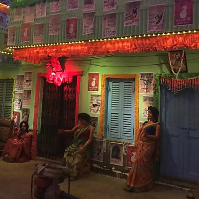 Imagine being swept along the streets of Calcutta by a crowd of over three hundred thousand people all visiting fantastical temporary pandals which are built from clay, silt, wicker, and papier-mache by local artisans every year to celebrate the festival of Durga Puja. Acclaimed writer and local resident Amit Chaudhuri, along with family members and friends, go pandal-hopping across the neighbourhoods of the city to tell the story of how the Hindu goddess Durga leaves her spiritual realm for five days every autumn and visits her mortal devotees to allow them to be seen by her. This devotional reassurance takes place inside the pandals which all contain an effigy, a murti, of Durga and curiously, displays reflecting particular current issues, from the overtly political to the blatantly commercial. Each neighbourhood has spent the previous year raising funds for the structures and over the years, the building of the pandals and their murti has become increasingly competitive, with each district vying to outdo the others in an carnival-like celebration of spirituality that is as much about Disney as it is about deity. The festival concludes when Durga returns to her spiritual home and the pandals no longer have purpose. They are dismantled and, followed by vast crowds, taken to the Ganges and immersed in the fast-flowing water where they dissolve and return as the silt which will be used to make new pandals for next year’s Durga Puja. Additional writing, editing and post production by John Wakefield. Location recording by Shuva Chakraborti. Producer: Roger James Elsgood (Photo: The street and houses leading up to the brothel pandal with dummies of sex workers. Credit: Amit Chaudhuri)
