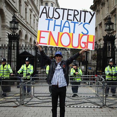 As the UK approaches a general election, both major parties have been promising billions of extra pounds to go into hospitals, social care and other public benefits. All this spells an apparent end to ten years of a policy of limited government spending, also known as austerity. The BBC’s Andy Verity explains austerity and what it was meant to do. But why has it ended now? Economists Vicky Pryce and Ryan Bourne debate the relative merit of austerity, whether it succeeded, or indeed whether it was a good idea to begin with. And if indeed the UK is returning to an age of more spending, Alberto Gallo of Algebris Investments warns those funds ought to be spent wisely. (Picture: A man holds up an anti-austerity banner outside Number 10 Downing Street on October 20, 2012 in London, England. Picture credit: Dan Kitwood/Getty Images)