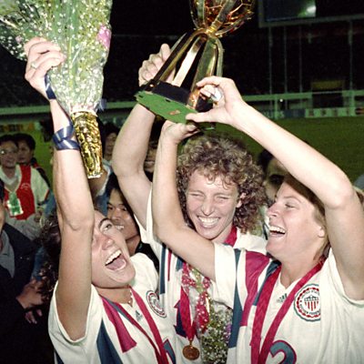 The USA beat Norway 2-1 in the final of the first official FIFA World Cup for women, held in China in 1991. The competition helped lay the foundations for female soccer both in America and worldwide. Carin Jennings-Gabarra was part of America's so-called "triple-edged sword" of goal-scoring forwards; she won the Golden Ball Award as the best player of the tournament. She shares her World Cup memories with Mike Lanchin. Photo: Michelle Akers-Stahl (C), Julie Foudy (L) and Carin Jennings (R) celebrating their victory in the 1991 FIFA Women's World Cup (Photo by TOMMY CHENG/AFP/Getty Images)