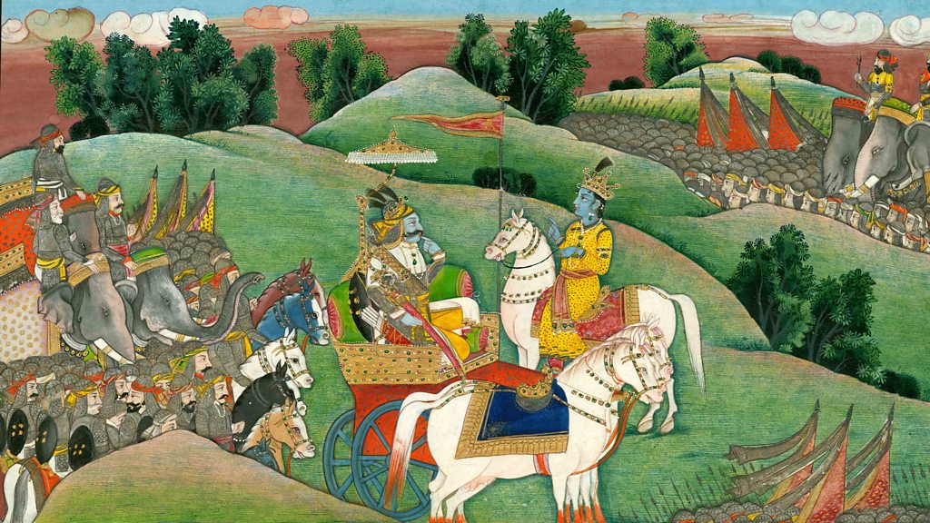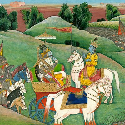 The Bhagavad Gita didn't start life as an exclusively religious text but over the two thousand years since it was composed the verses have taken on many different layers of meaning. For millions of Hindus today, the Gita has a similar scriptural status to the Quran for Muslims or the Bible for Christians. In the 20th century, others have seen the Gita as a guide to management strategy, a tool for self-help and even a call to arms for Indian independence in the face of British colonial rule. The story begins on a battlefield with the warrior Prince Arjuna suffering a breakdown. As warring families line up on opposing sides, Arjuna appeals to his charioteer Krishna for help in overcoming this existential crisis. In the 700 verses which follow, Krishna presents his friend with three options: the paths of action, knowledge and devotion. Joining Bridget is Professor Chakravarthi Ram-Prasad from the University of Lancaster in the UK, Professor Angelika Malinar from the University of Zürich, Switzerland, and from the US Professor Richard Davis, the author of The Bhagavad Gita: A Biography. Image: Indian art depicting the dialogue between Lord Krishna and Arjuna. (Fine Art Images/Heritage Images/Getty Images)