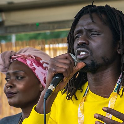 The Arts Hour is backstage at Womad, the UK’s biggest festival of international music and dance Nikki Bedi and Nicki Paxman are on site in the fields surrounding Charlton Park country house, to join the party and meet the musicians as they play to a crowd of 30,000 people, many of whom are camping on site for the weekend. Rapper and activist Emmanuel Jal, performing with his sister Nyaruach, tells us how the two of them were reunited after many years of separation and explains how he uses music to share the trauma of his past as a child soldier in South Sudan Ta Dhom Project reveal how they combine South Indian percussion with Mumbai rap and Bex Burch, from the London trio Vula Viel, describes her time living in Ghana learning to make, and play, the Gyil xylophone. Mauro Durante traces the powerful folk music of his southern Italian band Canzoniere Grecanico Salentino back to the ancient healing rituals of tarantism and singer Gili Yalo recounts the long and perilous journey he made as a child, from Ethiopia to Israel, that made him the musician he is now. And Buba Murgulia, founder of the male voice Iberi choir from Georgia, reveals the connection between rugby and singing. (Photo: Emmanuel Jal and his sister Nyaruach. Credit: Gary Jones)