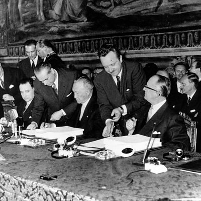The hurried signing of the Treaty of Rome in 1957 which led to greater European unity, plus 1992 - when the British royal family started to reform its role after a year of scandal and disaster. Also on the programme, the horrific gang rape which prompted India to rethink its laws, the storm that helped British tree experts make an important scientific discovery and the woman born to slaves who became the first self-made female millionaire. Photo: European leaders at the Palazzo dei Conservatori in Rome. Credit: Keystone/Getty Images