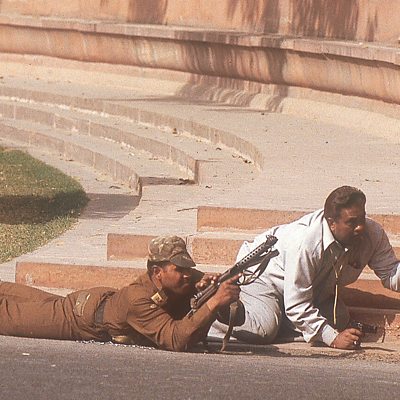 In December 2001 armed men attacked India's Parliamentary compound in broad daylight. Islamist extremists were blamed and the attack brought India and Pakistan to the brink of war. Indian politician Renuka Chowdhury was just arriving at the Parliament building when the shooting started. She has been telling her story to Prabhat Pandey. Photo: Security forces outside the Parliament building during the attack in Delhi. (Credit: Bandeep Singh/The India Today Group /Getty Images)