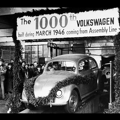 The story of how a car that had originally been the idea of Nazi leader Adolf Hitler was saved by a British army officer at the end of World War Two. In August 1945 the British Army sent Major Ivan Hirst to take control of the giant Volkswagen plant in Germany, built under the Nazis to produce 'people's cars' for the German masses. Ivan Hirst persuaded the British authorities to allow production to restart of the Volkswagen Beetle, which Hitler had had designed before the war as an affordable car for ordinary Germans and which would become one of the most successful cars in the world. Louise Hidalgo has been listening to archive of Major Hirst talking about that time. Picture: Major Ivan Hirst (right) driving the 1000th Beetle off the production line at Wolfsburg in March 1946 (Credit: Volkswagen AG)