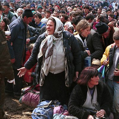 Hundreds of thousands of Kosovan Albanians were forced to leave their homes when NATO started bombing Serb targets in the former Yugoslavia in 1999. By the time the bombing stopped, on June 10th 1999, over 800,000 people had been displaced. Qerim Nuridhini is a Kosovan Albanian refugee who fled first to the Former Yugoslav Republic of Macedonia, and then to the UK. He's been speaking to Rachel Wright. A refugee from Kosovo confronting a Macedonian Policeman at Blace, Macedonia, April 5th 1999.(Photo By Sean Gallup/Getty Images)