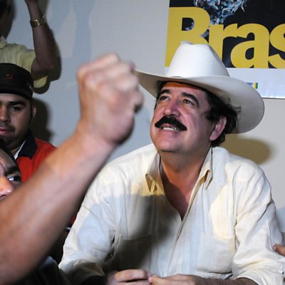 In September 2009 the deposed president of Honduras, Manuel Zelaya, made a sudden return from exile, seeking refuge in the Brazilian embassy in the Honduran capital. Zelaya had been whisked out of the country at gunpoint after a military coup three months earlier. His unexpected return took the coup leaders totally by surprise. Mike Lanchin has been hearing from two men who spent several months holed up inside the embassy building alongside the Honduran leader. Photo: Manuel Zelaya with supporters inside Brazil's embassy (Credit should read ORLANDO SIERRA/AFP/Getty Images)