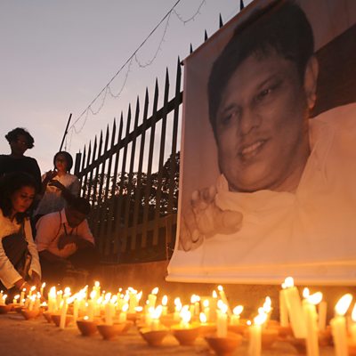 The assassination of newspaper editor, Lasantha Wickramatunga, shocked the world in 2009. Sri Lanka's civil war between the Sinhalese majority and the Tamil minority was nearing its climax when he was shot dead by gunmen on motorbikes. After his murder his newspaper, the Sunday Leader, printed his final article in which he predicted his own death and wrote that the government would be behind his killing. Farhana Haider has been speaking to his widow, Sonali Samarasinghe, about press freedom in Sri Lanka. (Photo: Journalists and well wishers light candles in front of a photograph of murdered editor Lasantha Wickramatunga on the first anniversary of his death 8 Jan, 2010. Credit: Getty images)