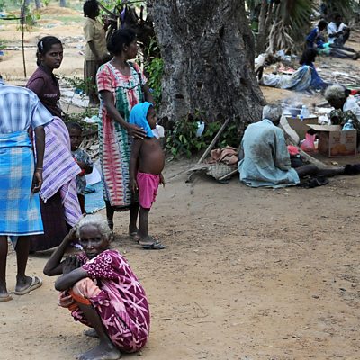 In May 2009 the Sri Lankan army finally crushed the Tamil Tiger rebels, ending 25 years of bloody civil war. In the final weeks of the conflict, thousands of civilians were trapped alongside the rebels under heavy shelling as the government forces closed in. Journalists and aid workers were prevented from reaching the war zone. Mike Lanchin has been hearing from one Tamil woman trapped in the siege zone, and from the former UN spokesman in Sri Lanka, Gordon Weiss, who watched on from the capital Colombo as the fighting came to an end. Photo: Tamil civilians standing on the roadside after crossing to a government-controlled area 2kms from the front-line (Getty Images)