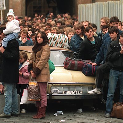 Thousands of East Germans fled to the West in the summer and autumn of 1989, before the fall of the Berlin Wall. Many of them sought refuge in the West German embassy in Prague, where they camped in the grounds and slept in stairwells and corridors, fed by the Red Cross. On September 30th, West German foreign minister Hans-Dietrich Genscher announced that they were free to travel to West Germany. Hubert and Susanne Kuhn lived in the embassy with their three children for three months. They spoke to Lucy Burns about their experiences. Photo: a crowd of East-German refugees in Prague wait to be transferred to West Germany after East Germany lifted restrictions on emigration (PASCAL GEORGE/AFP via Getty Images)