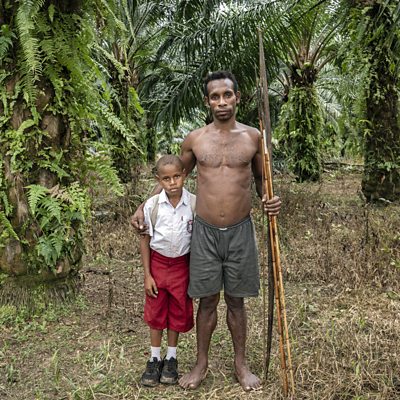 Indonesia is the world’s largest exporter of palm oil, a product found in everything from shampoo to soup; in the last two decades vast areas of forests have been cleared to make way for plantations. The remote province of Papua, home to Asia’s largest remaining rainforests has escaped fairly untouched...until now. It's the new frontier for unfair palm oil expansion. In this remote region Rebecca Henschke and Ayomi Amindoni investigate allegations of unfair land deals, violations of indigenous rights and illegal burning. (Image: Tadius Butipo, 30 years old, with his son, in a oil palm plantation. Credit: Albertus Vembrianto/BBC)
